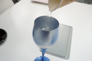 シルバーに変わりました!熱湯を注いだ直後はこのように境目がくっきりと出ますが、時間の経過とともにワイングラス全体が温まり、フチまで青みがかかったシルバーになります。